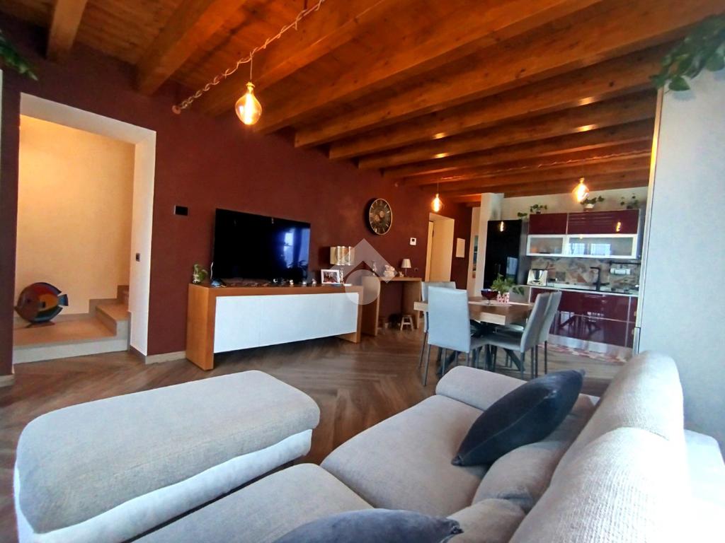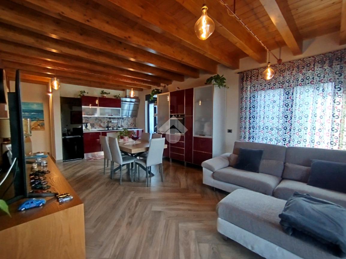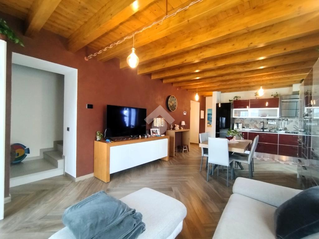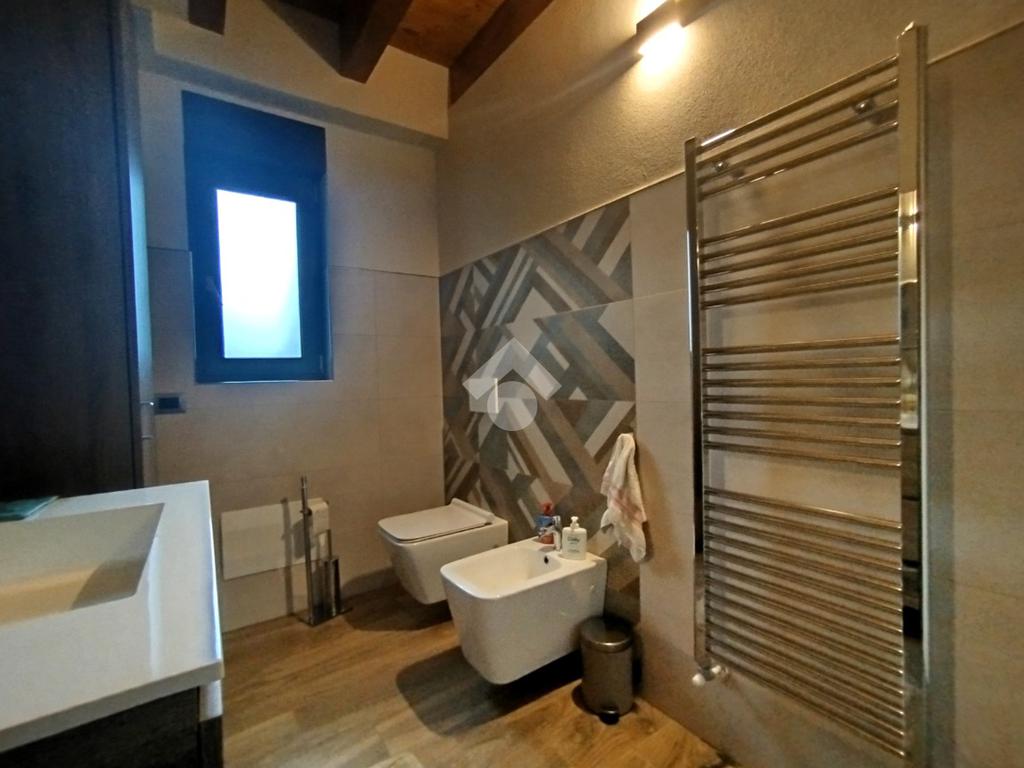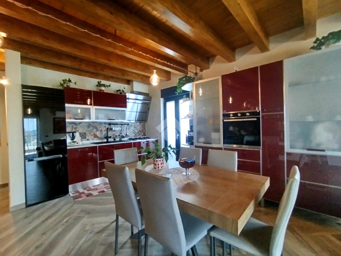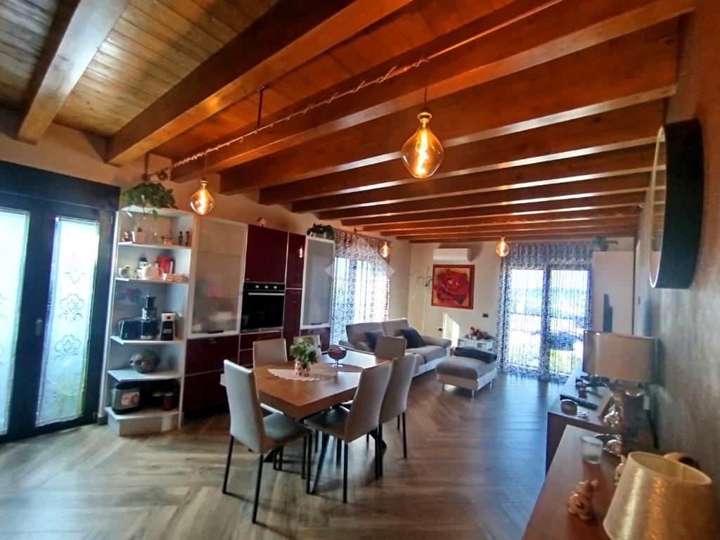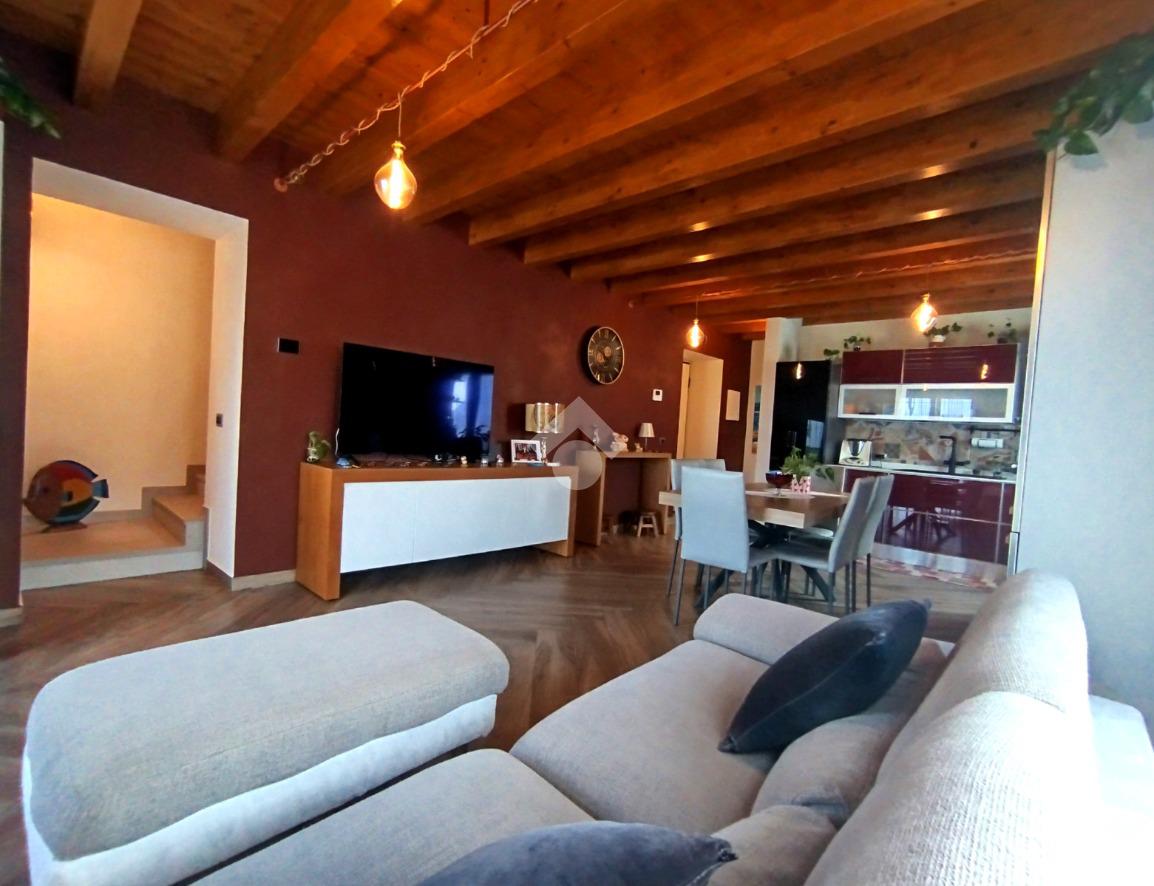 Luminoso ed elegantemente rifinito, è caratterizzato dalle travi a vista in entrambi i piani, che conferiscono calore ed ospitalità. L'ingresso, con portoncino blindato, si affaccia direttamente sulla luminosa ed ariosa zona giorno, un open space plurifinestrato completo di zona pranzo ed area living, dove trascorrere momenti di convivialità e relax con amici e parenti; il primo piano abitativo si completa con il bagno finestrato dotato di una comoda doccia e sanitari sospesi. La funzionale scala interna conduce al piano totalmente dedicato alla zona notte. Il disimpegno centrale disloca egregiamente i tre ambienti distribuiti su questo livello, due camere da letto ed un bagno completo di vasca e lavanderia. La proprietà si completa con il box singolo ed un posto auto scoperto.