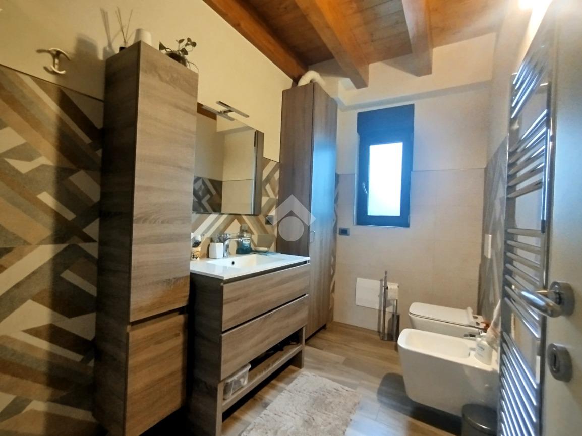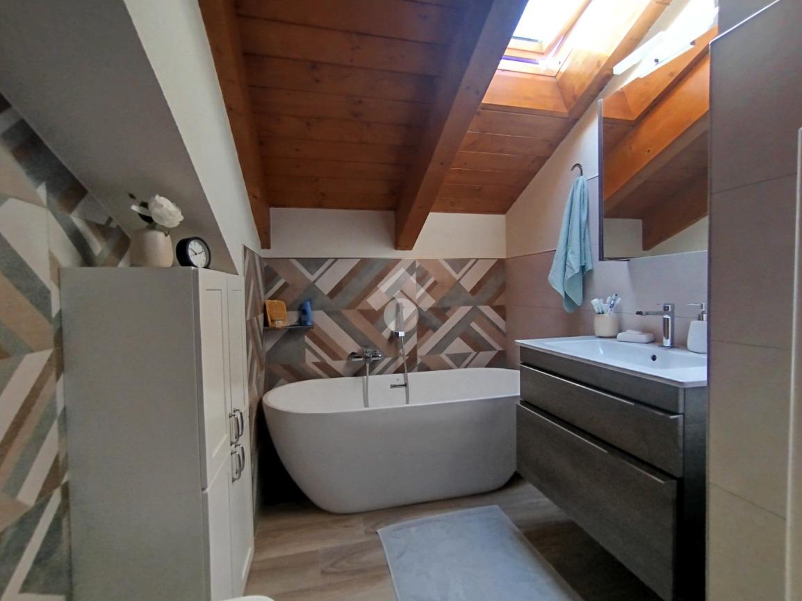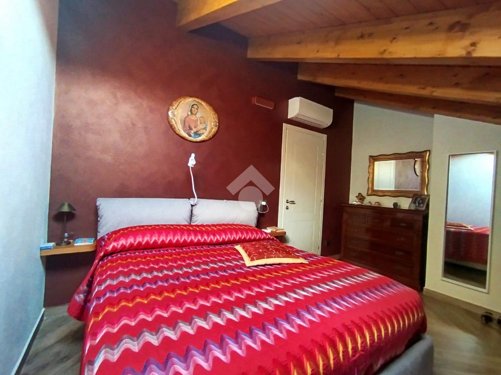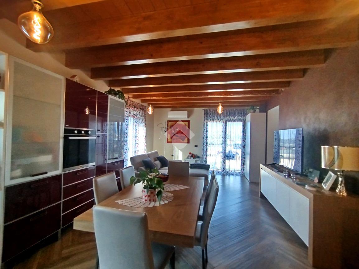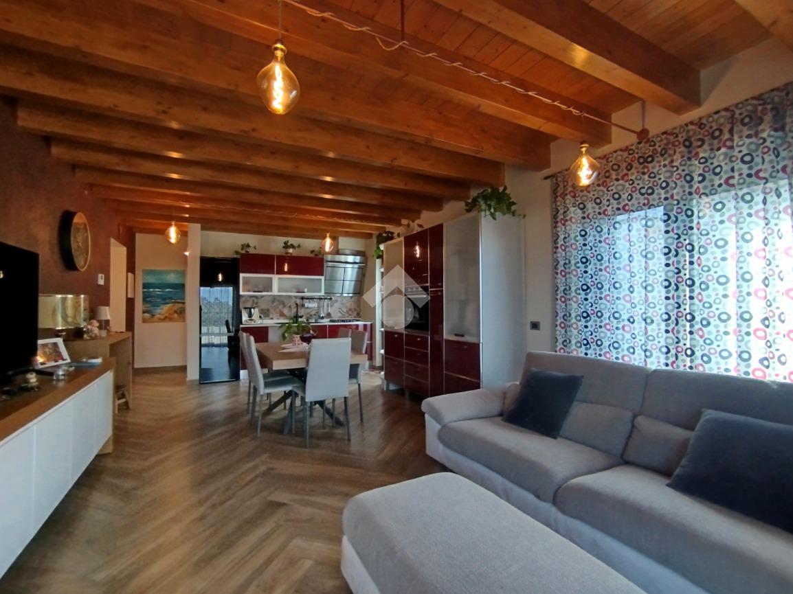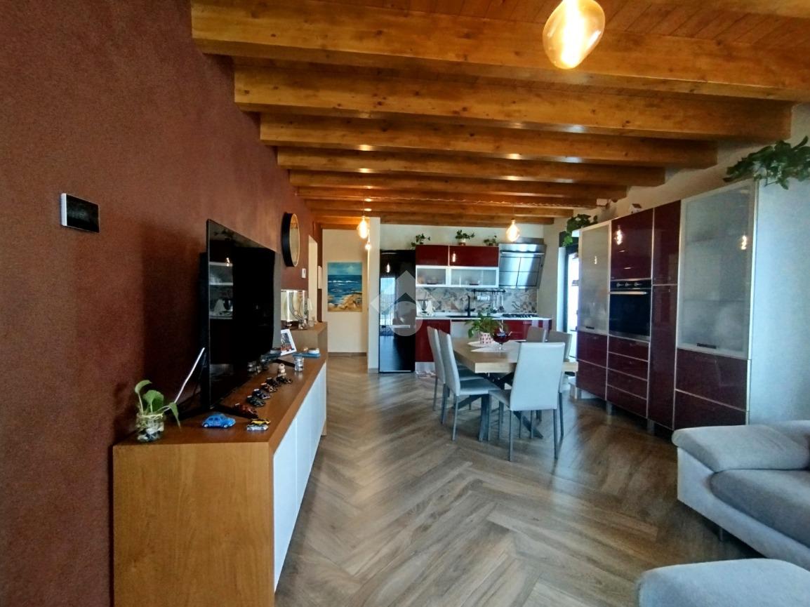Luminoso ed elegantemente rifinito, è caratterizzato dalle travi a vista in entrambi i piani, che conferiscono calore ed ospitalità. L'ingresso, con portoncino blindato, si affaccia direttamente sulla luminosa ed ariosa zona giorno, un open space plurifinestrato completo di zona pranzo ed area living, dove trascorrere momenti di convivialità e relax con amici e parenti; il primo piano abitativo si completa con il bagno finestrato dotato di una comoda doccia e sanitari sospesi. La funzionale scala interna conduce al piano totalmente dedicato alla zona notte. Il disimpegno centrale disloca egregiamente i tre ambienti distribuiti su questo livello, due camere da letto ed un bagno completo di vasca e lavanderia. La proprietà si completa con il box singolo ed un posto auto scoperto.