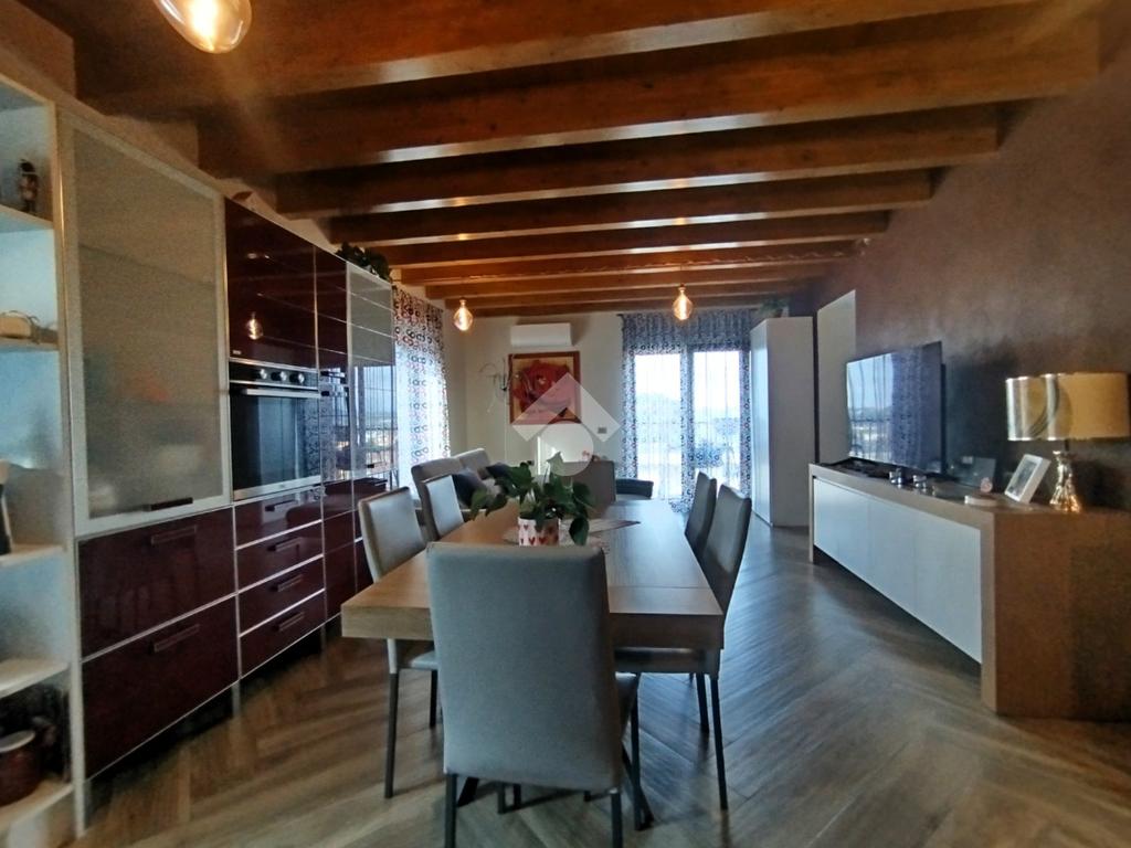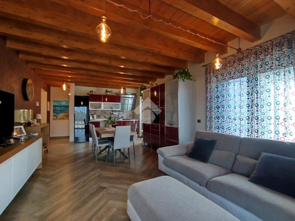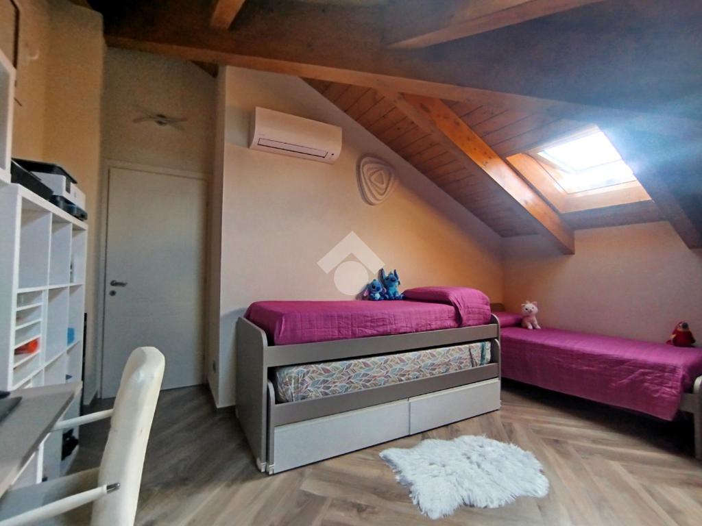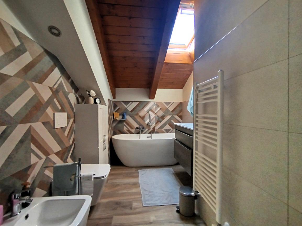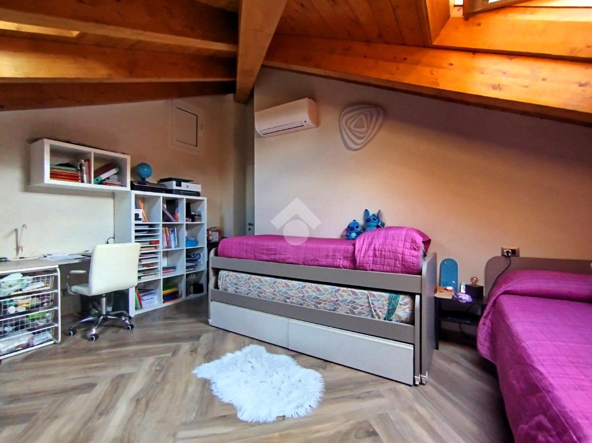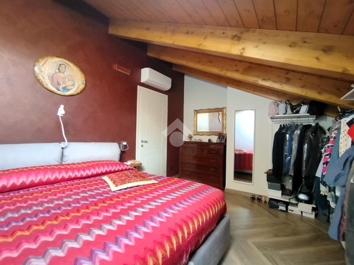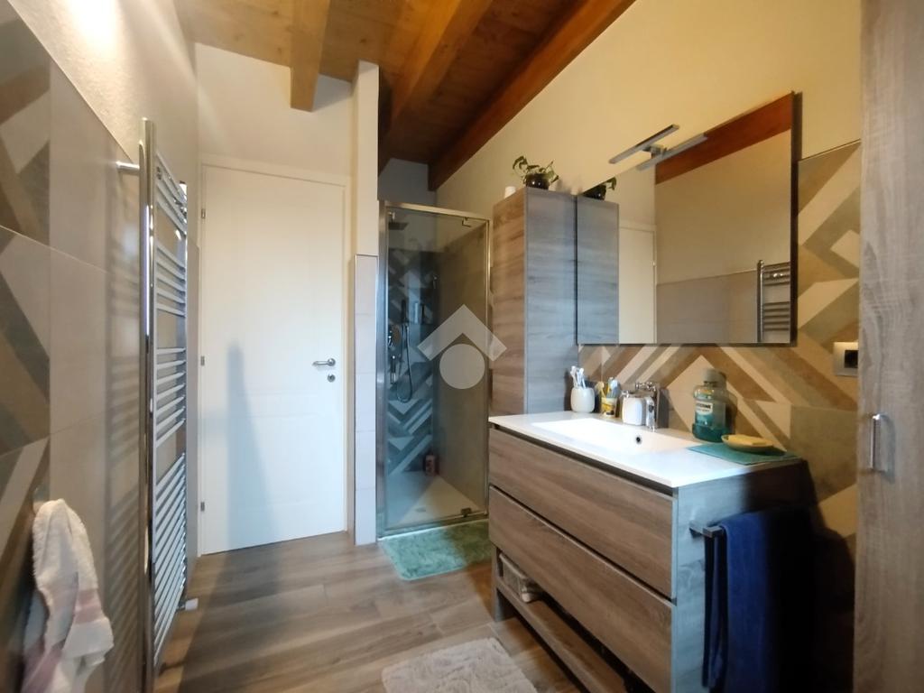 Luminoso ed elegantemente rifinito, è caratterizzato dalle travi a vista in entrambi i piani, che conferiscono calore ed ospitalità. L'ingresso, con portoncino blindato, si affaccia direttamente sulla luminosa ed ariosa zona giorno, un open space plurifinestrato completo di zona pranzo ed area living, dove trascorrere momenti di convivialità e relax con amici e parenti; il primo piano abitativo si completa con il bagno finestrato dotato di una comoda doccia e sanitari sospesi. La funzionale scala interna conduce al piano totalmente dedicato alla zona notte. Il disimpegno centrale disloca egregiamente i tre ambienti distribuiti su questo livello, due camere da letto ed un bagno completo di vasca e lavanderia. La proprietà si completa con il box singolo ed un posto auto scoperto.