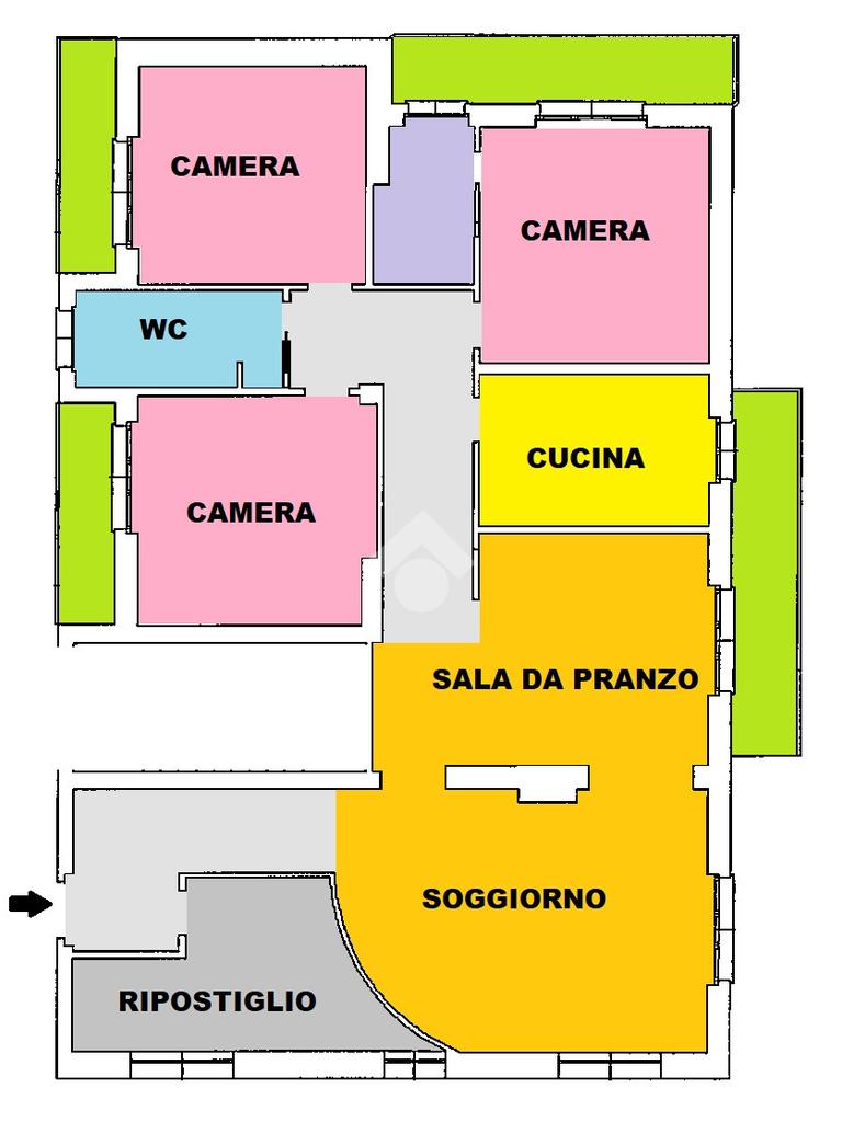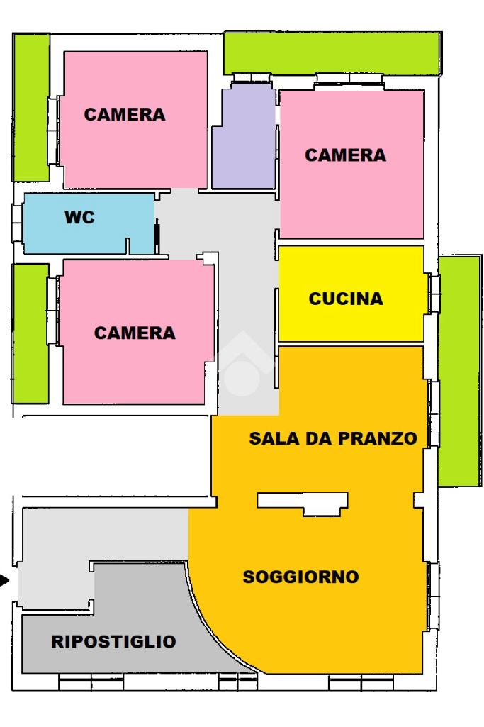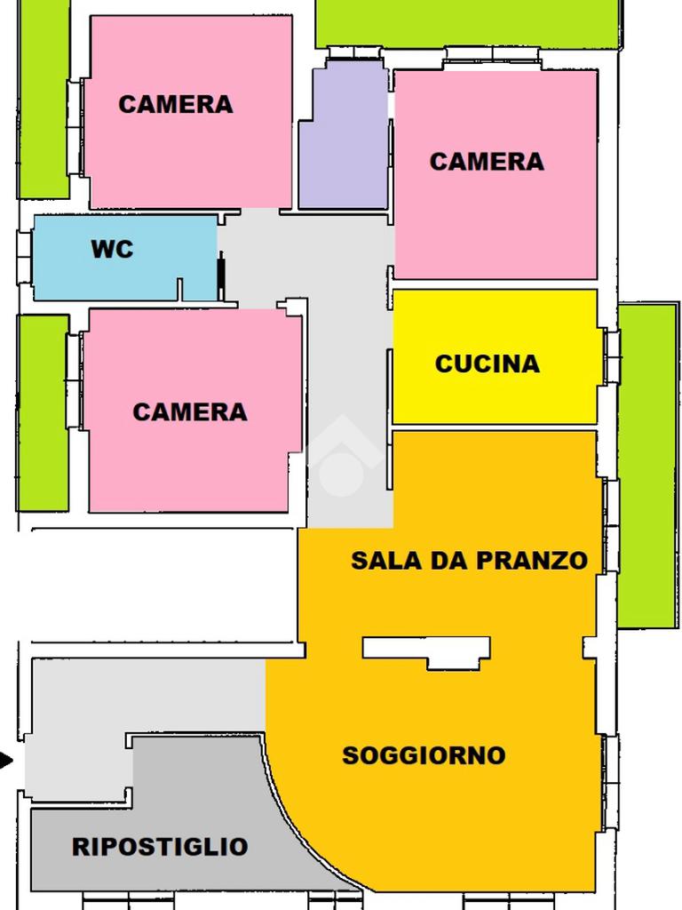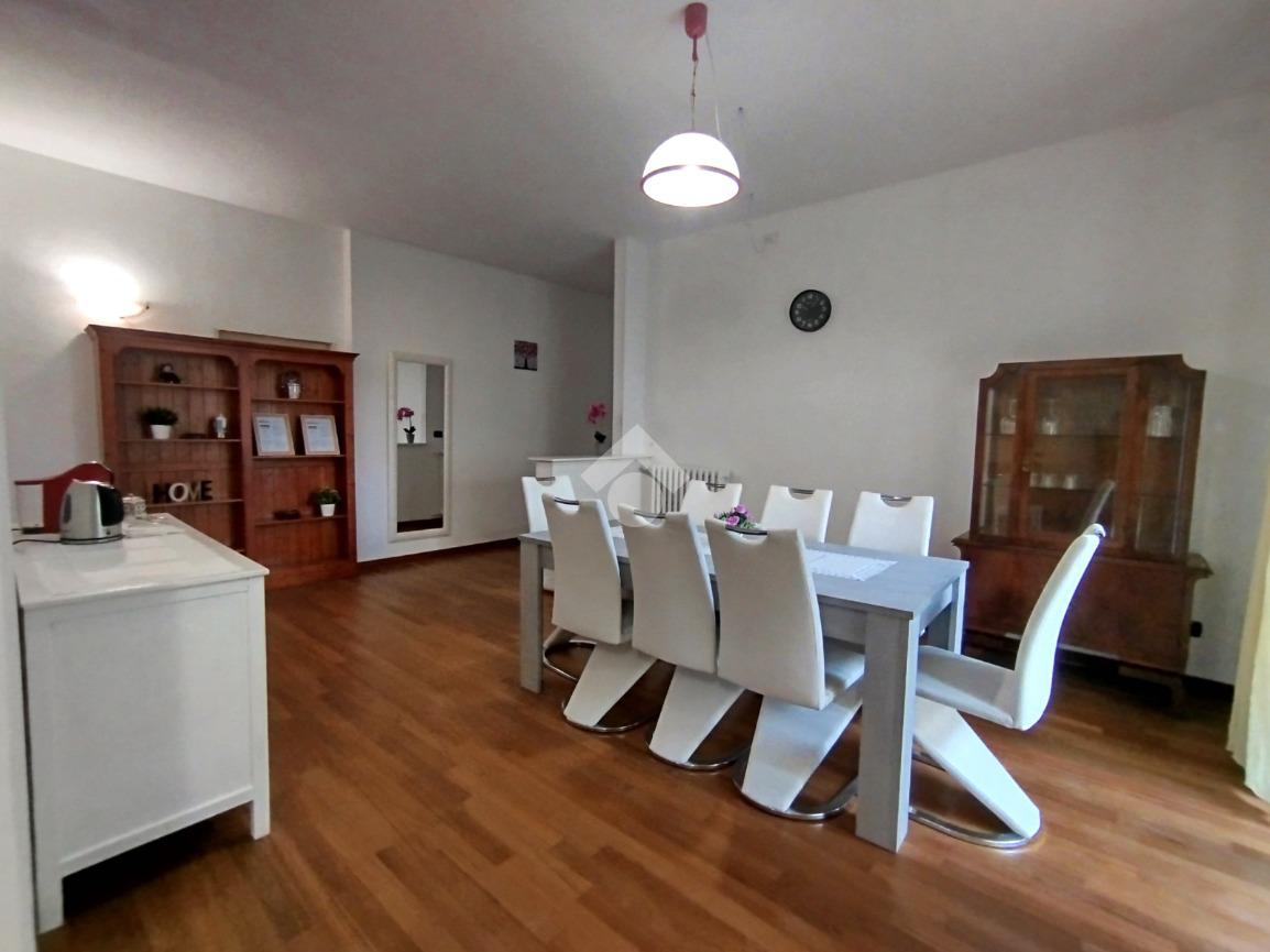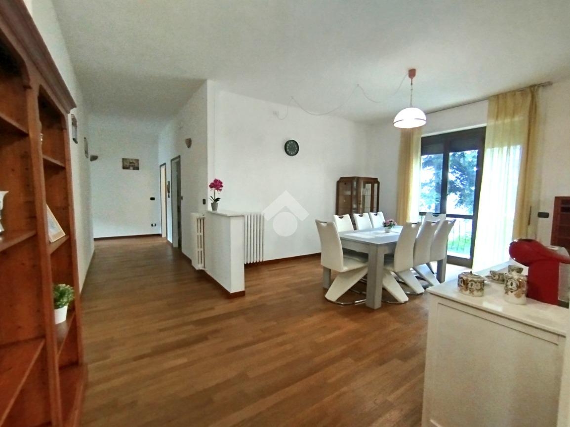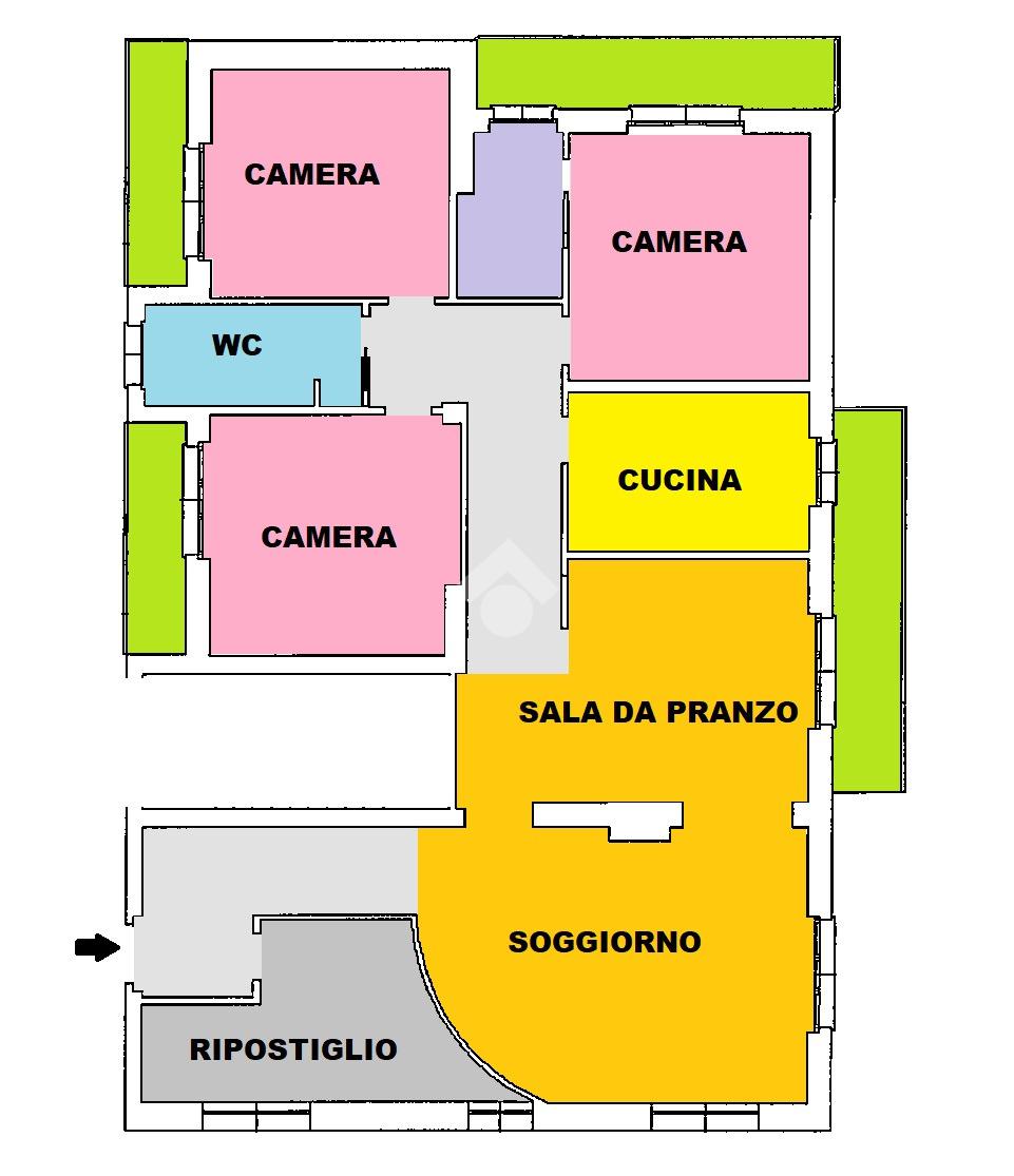 Libero sui quattro lati l'immobile, gode di spazi invidiabili, luminosi ed ariosi, ideali ad accogliere una famiglia numerosa. L'ingresso indipendente è ampio e gode di un comodo ripostiglio; la zona giorna si compone di un'accogliente salotto e di una zona pranzo/ cena attigua alla cucina separata e abitabile. Il disimpegno centrale disloca la zona notte composta dalle tre spaziose camere da letto, complete di balcone, e dal bagno finestrato completo di funzionale box doccia. La proprietà si completa con il box al piano terra.