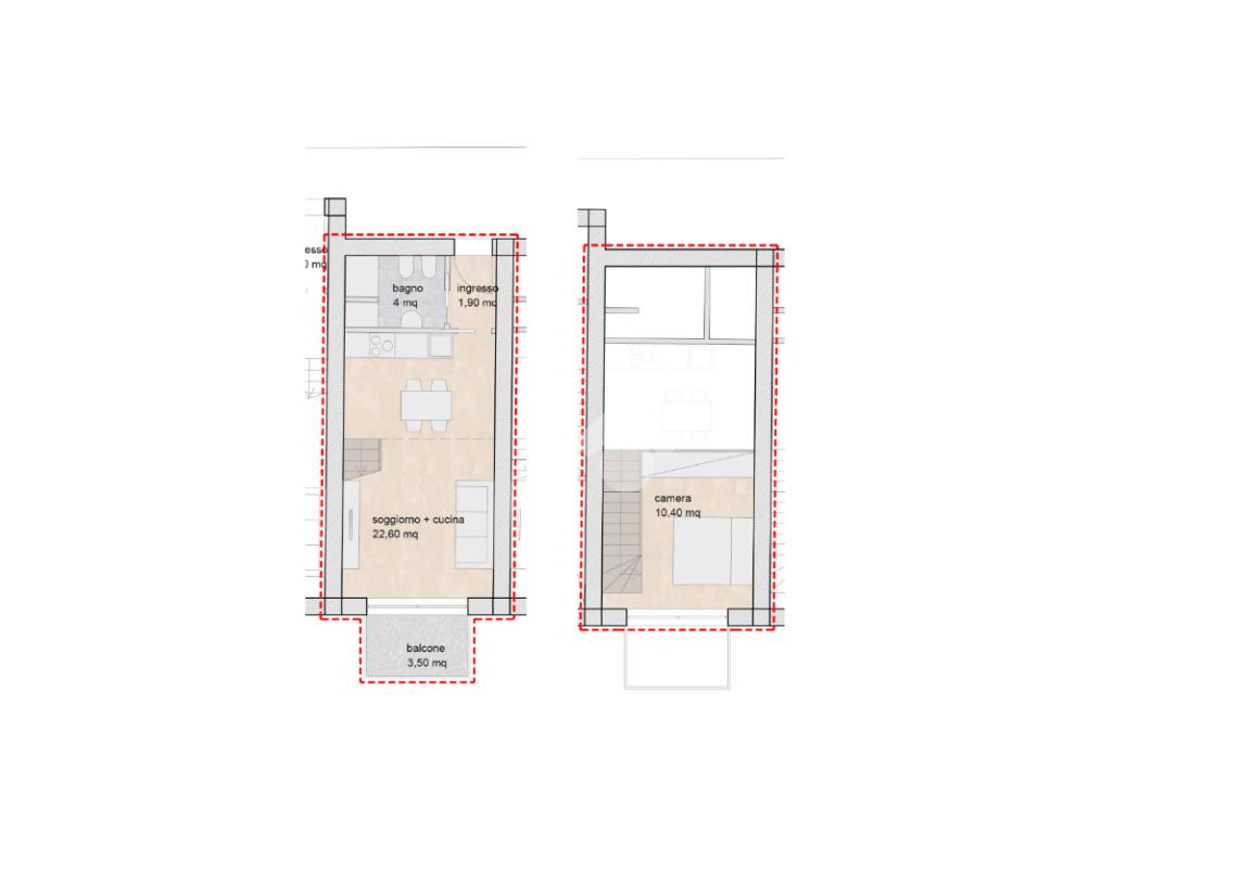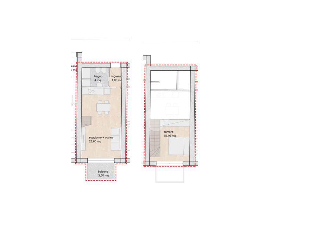 I bilocali, tutti ubicati al primo piano, si caratterizzano per la particolare disposizione interna: l'ingresso ampio si affaccia sulla luminosa zona giorno composta dall'angolo cottura, il living ed un fruibile balcone, oltre al bagno cieco con box doccia. La spaziosa camera da letto invece, è soppalcata raggiungibile da una comoda scala interna. La proprietà si completa con la cantina ad € 5.000,00 ed il posto auto scoperto ad € 15.000,00.