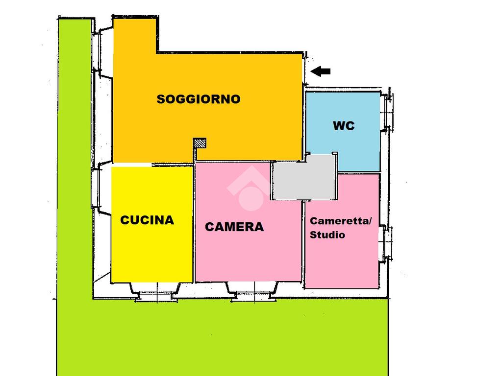 Varcando il portoncino d'ingresso siamo accolti direttamente nella zona giorno, un ambiente luminoso attiguo al cucinotto separato e semi abitabile. La zona notte invece, totalmente disimpegnata, gode di una camera, di una cameretta/studio e di un bagno finestrato completo di box doccia. Completa la soluzione il posto auto coperto e la porzione di giardino ad uso esclusivo e perpetuo.